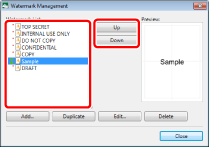 The [Watermark Management] dialog box displayed by clicking [Watermark Management] on the [Page Settings] tab on the Details Window