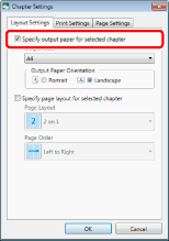 When the output paper size is set to [Auto (Size)] for the entire document or each chapter and the [Specify page layout for selected chapter] check box is not selected, if you set the page layout to a value other than [1 on 1] for the entire document, the output paper size set for the chapter is disabled.