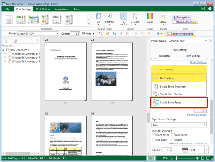 (Staple) on the ribbon and select [Staple Same Pages Using Eco Function].