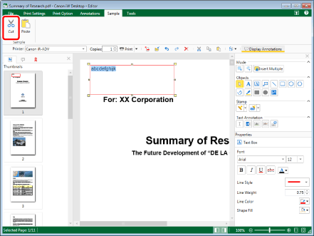 If you perform the paste operation when the annotation to be copied/cut is deselected, the copied/cut text string is pasted as a