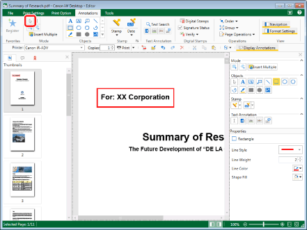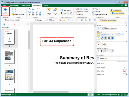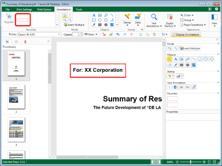 If multiple annotations are selected and registered in Favorites, those registered annotations will be grouped when inserted. For more information on grouping annotations, see the following.
