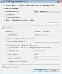 If you select the [Always use this setting] check box, the [Detailed Settings for PDF Document] dialog box is not displayed from next time. To display a dialog box when dropping a file, select the [Display dialog box when [Convert to PDF (Detailed Settings)]] check box.