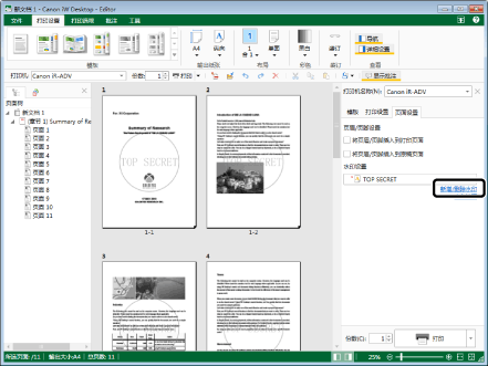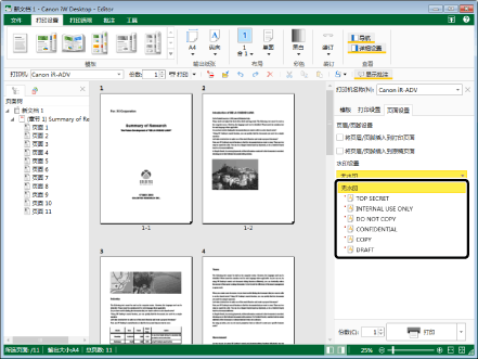 如果通过单击详情窗口[页面设置]选项卡上[新增/删除水印],并在显示的[新增/删除水印]对话框的[当前水印设置]中添加了多个水印,则详情窗口[页面设置]选项卡的水印下拉列表会更改为[自定义]。