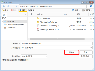 若選取「設定詳細資料並轉換成 PDF 文件」,便會顯示「PDF 文件的詳細設定」對話方塊。如需更多「PDF 文件的詳細設定」對話方塊的相關資訊,請參閱下文。