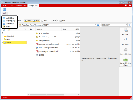在文件列表视图窗口中,可以选择文档查看方法:缩略图视图或列表视图。
