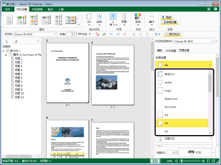 如果对于包含不同页面方向或大小的文档,将输出纸张大小设置为 [自动大小] 之外的其他选项,则纸张方向/大小与当前纸张方向/大小不同的页面将自动放大或缩小以适合纸张宽度(而不会自动旋转)。