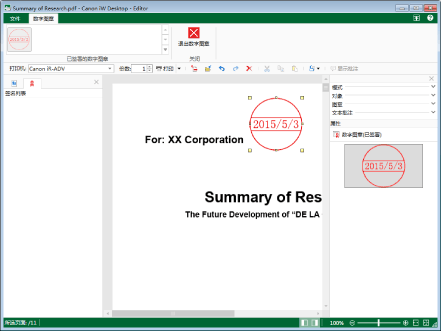 如果在开启数字图章模式之前切换到功能区上的[打印设置]选项卡或[打印选项]选项卡,单击[保存]将显示确认消息。如需将文件保存为PDF文档,单击[是]。