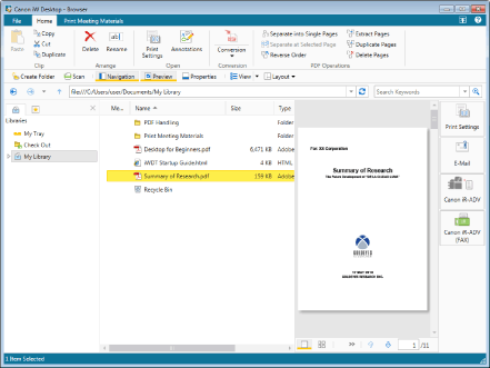 Documents in libraries can be printed, sent by fax, sent by e-mail, and edited from the Desktop Browser screen. Since folders in a library and external devices such as imageRUNNER ADVANCE can be monitored, the status of documents that have been added or updated and the status of external devices can be checked in the Desktop Browser screen.