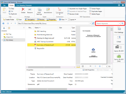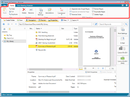 The ribbon includes tabs with commands for performing operations on and editing documents stored in libraries and commands for printing materials.