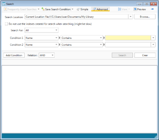 The Search Screen also provides the items for configuring detailed search conditions, performing a search, and saving search conditions.