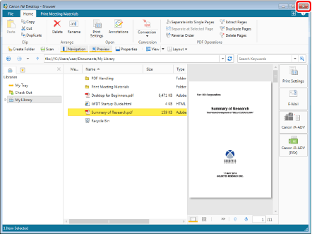 Desktop Browser opens with the same window as when it was last exited. However, when you restart the Desktop Browser, the Navigation Window starts by displaying the [Libraries] tab even if it displayed the [Search Conditions] tab before the restart.