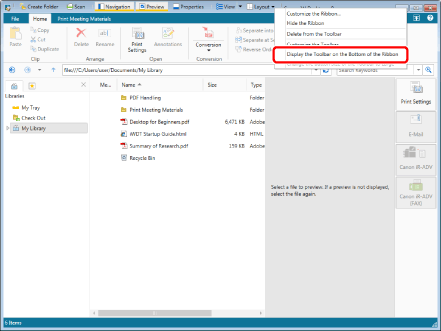 Right-click the ribbon or toolbar and select [Display the Toolbar on the Top of the Ribbon].