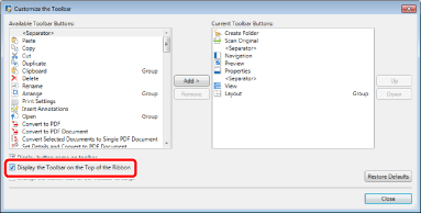 Right-click the ribbon or an area on the toolbar with a button and select [Display the Toolbar on the Bottom of the Ribbon].