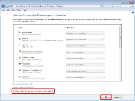 Select the [Always show all icons and notifications on the taskbar] check box, and click [OK].