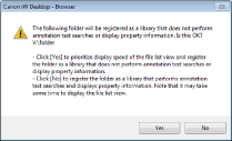 For a library in an Advanced Box, it may take a while to process the annotation information of the PDF document. If you click [Yes], the settings are changed so that searching or displaying of [Inserted Annotations] will not be performed on the confirmation screen that is displayed when you register a library, and you can avoid this problem.