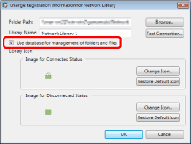 (The [Use database for management of folders and files] check box is selected, the default color of [Library Icon] is green)