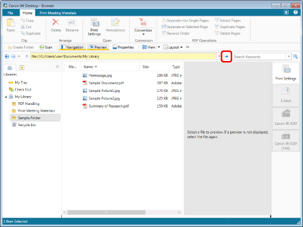 When you enter a document path in the address bar, the folder in which the document is stored in the Navigation Window is displayed. The document is selected in the File List View Window, and then the application associated with the document starts and displays the document.