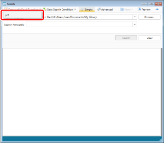 The path of the search target library or folder is displayed in [Search Location] on the Search Screen. The saved search conditions are also displayed.