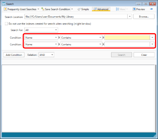 The [Do not use the indexes created for search when searching (might be slow)] check box is displayed when a Network Library (database) is selected as the search target. Select this check box to search without using a database.