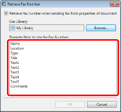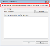 Fax numbers can be retrieved automatically only from documents stored in a library that you have selected in the [Retrieve Fax Number] dialog box. Fax numbers cannot be retrieved from documents in other libraries, even if fax numbers are set in their properties.