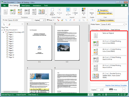 You can select a print settings template set in advance to apply print settings to the document you are editing.