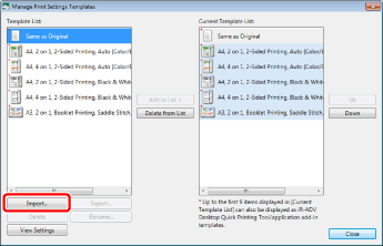 The template is imported and added to [Template List] and [Current Template List] in the [Manage Print Settings Templates] dialog box.