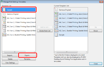 The top nine templates displayed in [Current Template List] in the [Manage Print Settings Templates] dialog box are the print templates specified in the Quick Printing Tool.