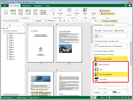 If you deselect the [Apply the color setting to preview] check box on the [Print Settings] tab on the Details Window, the ribbon command, or the tool button, the preview is displayed in color even if you set the color mode to [Black & White].