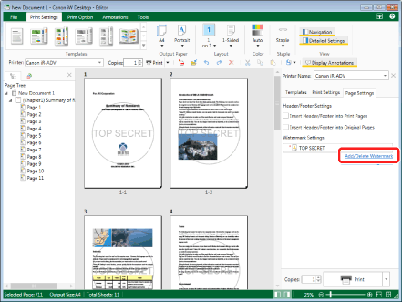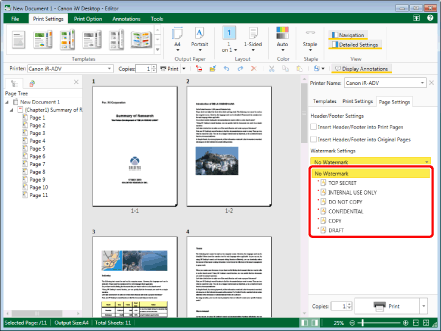If you added multiple watermarks to [Currently Set Watermarks] in the [Add/Delete Watermark] dialog box displayed by clicking [Add/Delete Watermark] on the [Page Settings] tab on the Details Window, the watermark pull-down list on the [Page Settings] tab on the Details Window changes to [Custom].