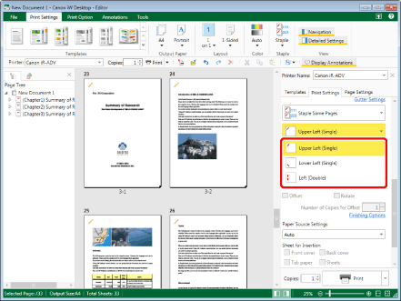 The settings that can be selected for the staple position vary according to the type of printer selected in [Printer], the output paper size/orientation, and the binding location.