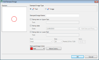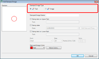 When [Text] is selected, you can register stamped images that use an enclosing circle, the specified text and date.