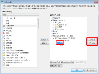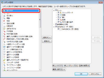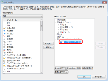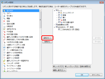 [リボンの設定]ダイアログボックスの左側の一覧から選択して、リボンに追加したグループには、コマンドを追加できません。
