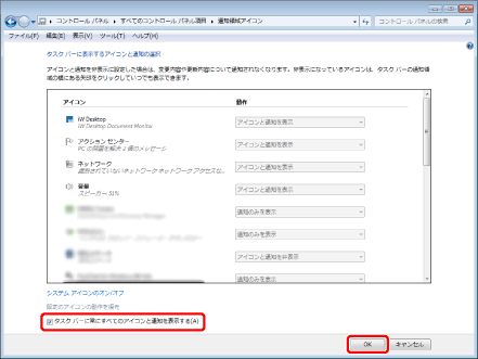 Printer MonitorとDocument Monitorのアイコン表示設定のみを変更したい場合は、次のアイコンの設定を[アイコンと通知を表示]に変更します。