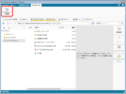 アドバンスドボックスのフォルダー1階層につき、格納および表示が可能な文書、およびフォルダーの合計は1000個です。これを超える分については、表示されなくなります。ただし、Desktopから個人ライブラリーとして登録したアドバンスドボックスのフォルダーの内容を表示した場合、Desktopが文書管理に関連して使用する他のファイル、およびフォルダー(以下、「Desktop用ファイル/フォルダー」とします)が存在します。これらはDesktop上では表示されないため、実際には最大表示数が1000個に満たない場合があります。