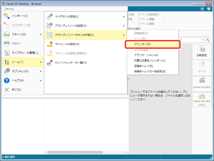 [ファイル]メニュー > [ツール] > [アウトプットバーの設定] > (設定を変更するプリンター名) > [変更]