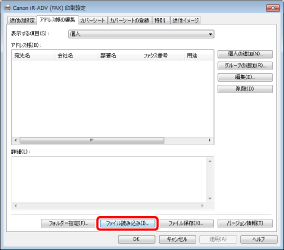 Canon Generic FAX Driverを使用している場合、[宛先選択]タブで[アドレス帳の編集]をクリックし、表示された[アドレス帳の編集]ダイアログボックスで[ファイル読み込み]をクリックします。