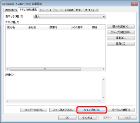 Canon Generic FAX Driverを使用している場合、[宛先選択]タブで[アドレス帳の編集]をクリックし、表示された[アドレス帳の編集]ダイアログボックスで[ファイル保存]をクリックします。