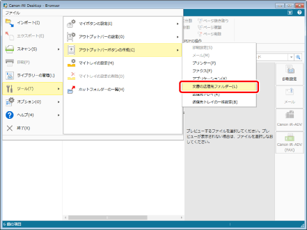 Desktop Editorからも文書の送信先フォルダーを作成できます。Desktop Editorから文書の送信先フォルダーを作成する場合は、[ファイル]メニュー > [登録/管理] > [文書の送信先フォルダーの作成]を選択します。