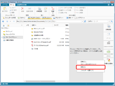 Desktop Editorからも文書の送信先フォルダーを削除できます。Desktop Editorから文書の送信先フォルダーを削除する場合は、[ファイル]メニュー > [登録/管理] > [文書の送信先フォルダーの設定] > (文書の送信先フォルダー名) > [削除]を選択します。