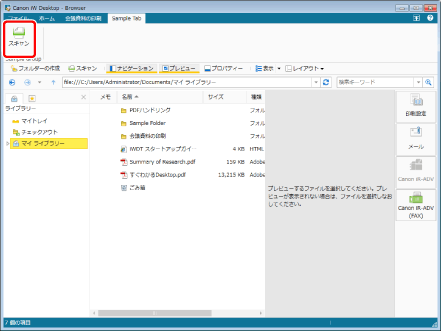 Desktop Browser画面からスキャンを実行し、紙文書のスキャン結果をライブラリー内のフォルダーに取り込む(登録する)ことができます。