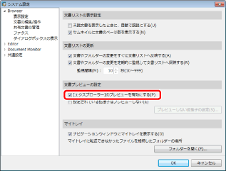 Desktop Browserのプレビュー機能は、Windowsエクスプローラーのプレビュー機能と同様のものです。Windowsエクスプローラーのフォルダーオプションで[プレビューウィンドウでプレビューのハンドラーを表示する]の設定とは無関係に、Desktop Browserの設定を有効にすることでOffice文書のプレビュー表示ができます。プレビュー表示は、ファイルタイプごとに実行されるため、まれに特定のファイルにおいてプレビュー表示ができないなどの問題が出る場合があります。このような場合は、Windowsエクスプローラーでプレビュー表示できるかどうか確認してください。