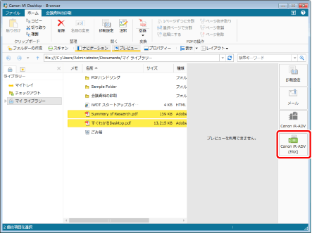 Desktop Browser画面のアウトプットバーからファクスを送信するには、アウトプットバーにファクスアウトプットボタンを登録しておく必要があります。また、文書を個別にファクス送信するには、ファクスアウトプットボタンの設定で[Editorで1文書ごとにファクス送信する]が選択されている必要があります。ボタンの登録方法、設定方法については、次を参照してください。