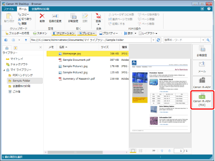 Desktop Browser画面のアウトプットバーからファクスを送信するには、アウトプットバーにファクスアウトプットボタンを登録しておく必要があります。また、Desktop Browser画面から外部アプリケーションを使用してファクスを送信するには、ファクスアウトプットボタンの設定で[文書に関連付けられたアプリケーションでファクス送信する]が選択されている必要があります。ボタンの登録方法、設定方法については、次を参照してください。