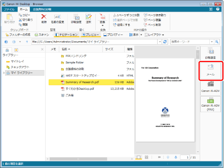 ライブラリーに登録されている文書を、PDF文書に変換してメール送信できます。詳細については、次を参照してください。