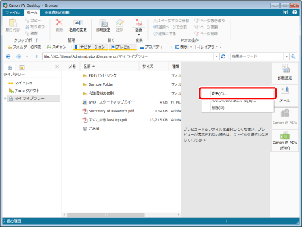 リボンやツールバーに表示させたメールアウトプットボタンの  をクリックして、[変更]を選択しても同じ操作ができます。リボンやツールバーにボタンが表示されていない場合は、次を参照して表示させてください。