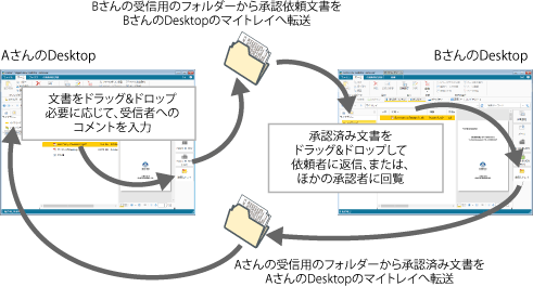 文書の送受信は、Desktop Browser画面のアウトプットバーに登録した送信先トレイアウトプットボタンと、ナビゲーションウィンドウの[ライブラリー]にあるマイトレイを使います。送信先トレイアウトプットボタンにドラッグ&ドロップした文書は、相手側のマイトレイに転送されます。マイトレイに届いた文書を、必要に応じて編集し、再度送信することで文書を回覧できます。