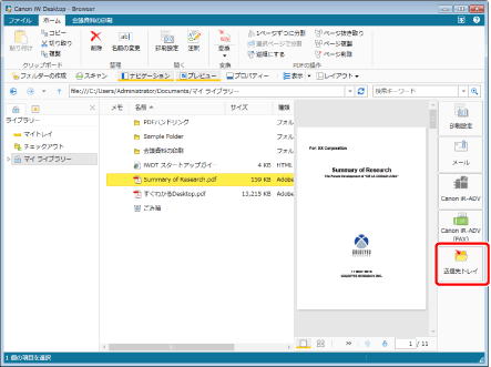 送信先トレイアウトプットボタンの設定で[文書の操作]が[移動する]に設定されている場合、送信した文書はDesktopから削除されます。送信した文書をDesktopに残す場合は、[コピーする]に設定してください。送信先トレイアウトプットボタンの設定については、次を参照してください。