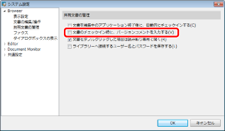 [システム設定] > [Browser] > [共有文書の管理] > [文書のチェックイン時に、バージョンコメントを入力する]