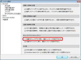 [システム設定] > [Browser] > [ダイアログボックスの表示] > [文書のチェックイン時に、確認メッセージを表示する]