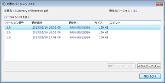 [文書のバージョンリスト]ダイアログボックスの[バージョンリスト]から文書を選択して[エクスポート]をクリックすると、選択したバージョンの文書をWindowsフォルダーに保存できます。詳細については、次を参照してください。